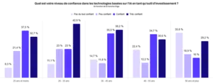 Par le biais de cette enquête, la relation entre les tranches d’âge et le niveau de confiance envers l’IA a été étudiée. Ainsi, à la question « Quel est votre niveau de confiance dans les technologies basées sur l’IA en tant qu’outil d’investissement ? », on constate que :