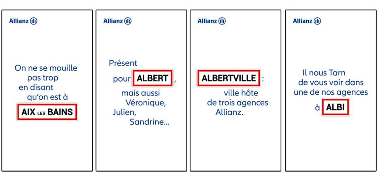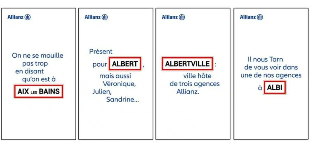 Avec un dispositif inédit en DOOH (Digital Out-Of-Home) conçu par Média Transports, Allianz propose des messages personnalisés dans 238 gares, adaptés spécifiquement à l’identité locale de chaque ville. Cette campagne, élaborée avec l’agence Ogilvy Paris, décline plus de 230 accroches humoristiques et locales, rédigées sans recours à l’intelligence artificielle, mais avec la participation active des équipes internes et même des clients.
